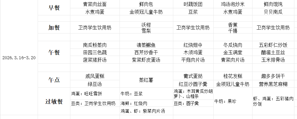 安庆师范大学附属龙城幼儿园营养食谱 2026年3月16日——3月20日