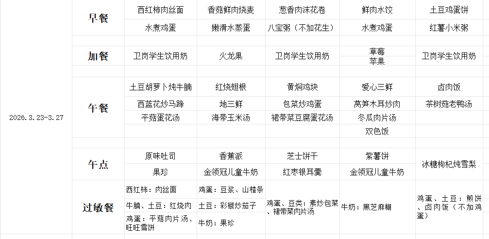 安庆师范大学附属龙城幼儿园营养食谱 2026年3月23日——3月27日 安庆师范大学附属龙城幼儿园 2026年3月20日 16:56 安徽 3人 在小说阅读器中沉浸阅读